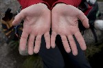 Logo abaixo uma sequência de fotos escalando a via Sexto Sentido nas Prateleiras e a última o estado das minhas mãos após essa via (que não é das piores, mas meu dedo esta um pouco desacostumado com aquele tipo de rocha). Fotos tiradas pela Jade.